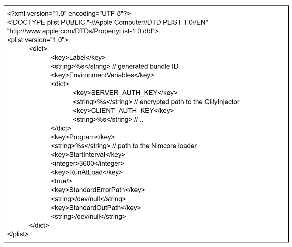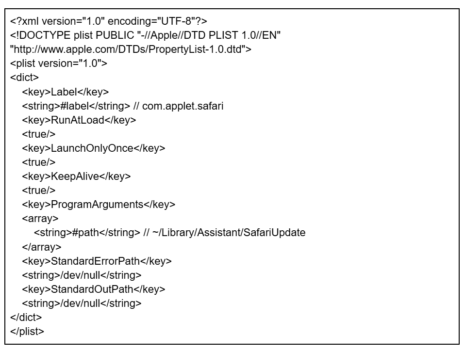 The contents of the plist file are hard-coded into the dropper in base64-encoded form. When decoded, the template represents a standard macOS LaunchAgent plist containing the placeholder tokens #path and #label. The malware replaces these tokens to customize the template. The final plist configuration ensures the launcher automatic execution by setting RunAtLoad to true (starts at login), KeepAlive to true (restarts if terminated), and LaunchOnlyOnce to true.