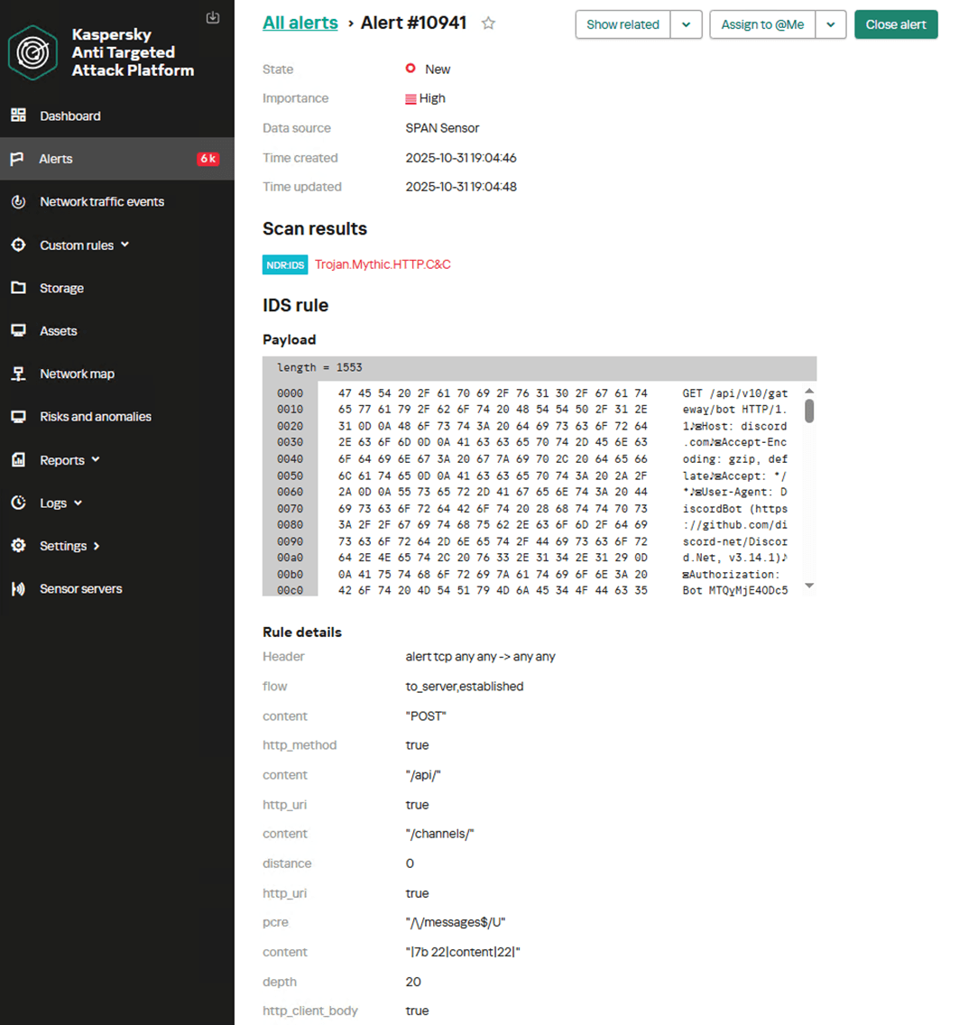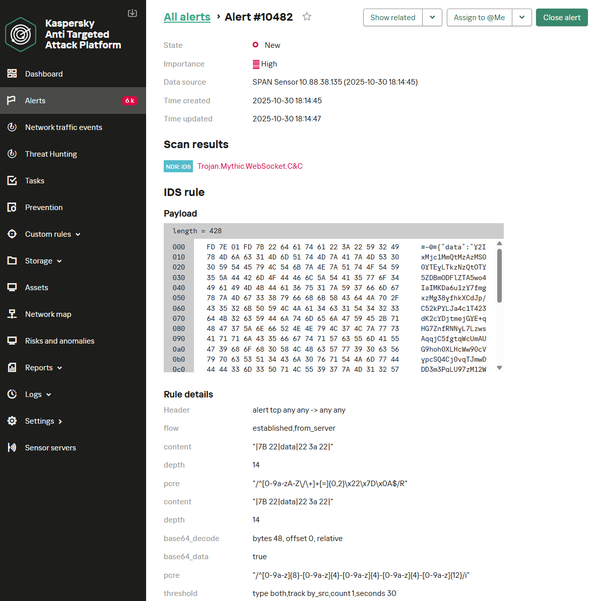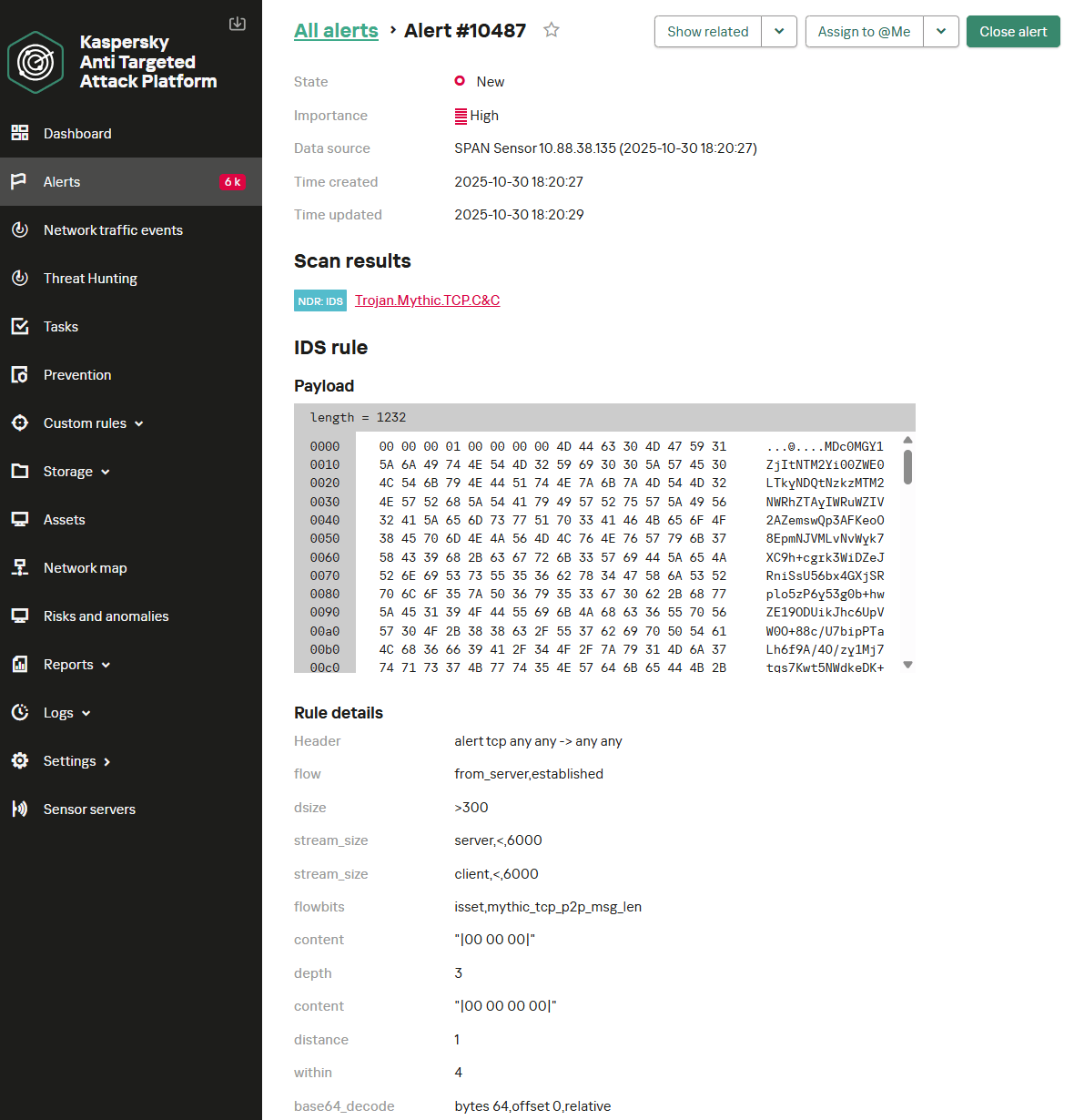 Mythic supports a wide array of agent management options utilizing several network protocols. Our analysis of agent communications across these protocols revealed that agent activity can be detected by searching for specific data patterns within network traffic. The primary detection criterion involves tracking UUID strings in specific positions within Base64-encoded transmitted data. However, while the general approach to detecting agent activity is similar across protocols, each requires protocol-specific filters. Consequently, creating a single, universal signature for detecting Mythic agents in network traffic is challenging; individual detection rules must be crafted for each protocol. This article has provided signatures that are included in Kaspersky NDR.
