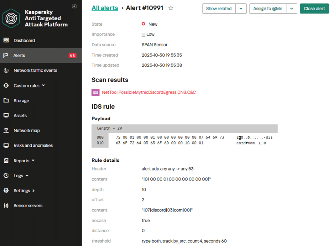 Kaspersky NDR is designed to identify current threats within network infrastructures. It enables the detection of all popular post-exploitation frameworks based on their characteristic traffic patterns. Since the network components of these frameworks change infrequently, employing an NDR solution ensures high effectiveness in agent discovery.