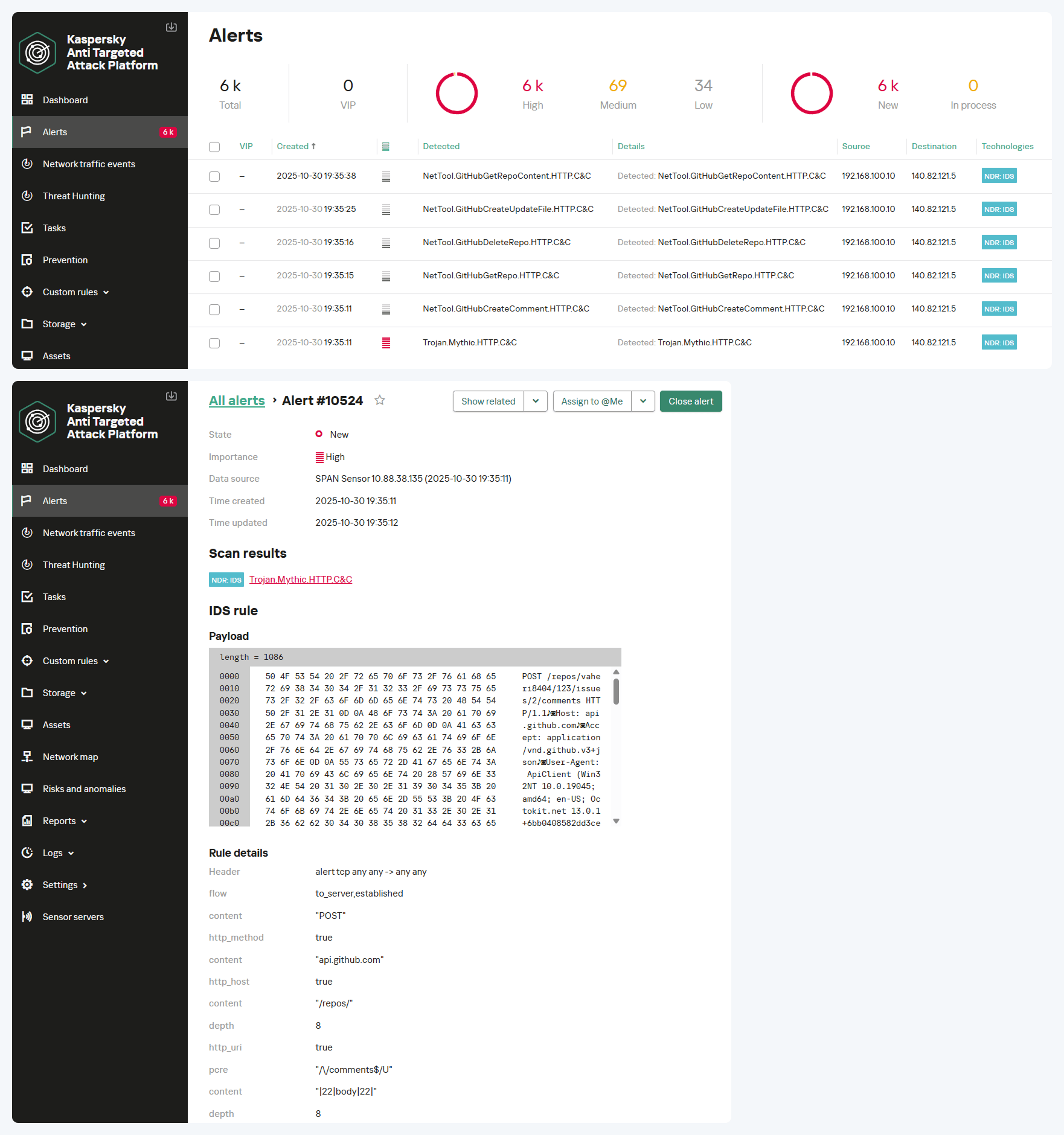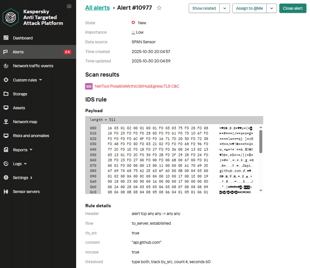 The screenshot below shows how the NDR solution logs all suspicious communications using the GitHub API and subsequently identifies the Mythic agent’s activity. The result is an alert with the verdict Trojan.Mythic.HTTP.C&C.