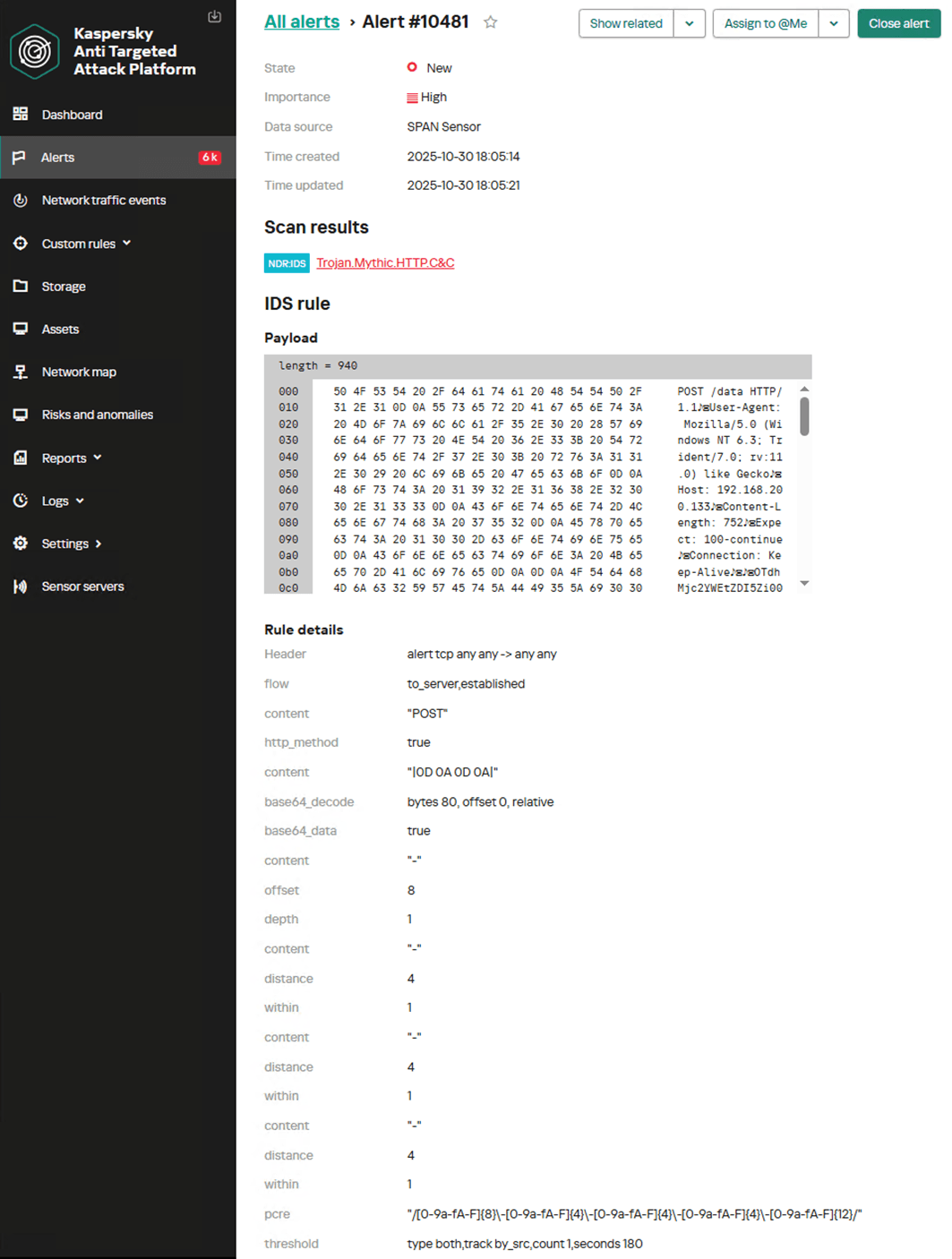 The screenshot below shows how the NDR platform detects agent communication with the server over HTTP, generating an alert with the name Trojan.Mythic.HTTP.C&C.