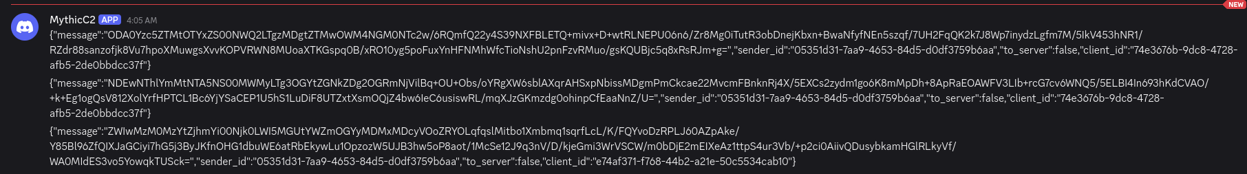Of particular interest to us is the message field, which contains the transmitted data encoded in Base64. The MythicMessageWrapper message is transmitted in plaintext, making it accessible to anyone with read permissions for messages on the Discord server.