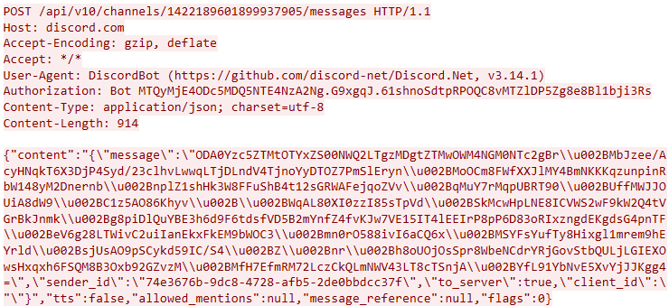 Below is a Suricata rule that detects the agent’s Discord-based communication activity. It checks the API activity for creating HTTP messages for the presence of Base64-encoded data containing the agent’s UUID.
