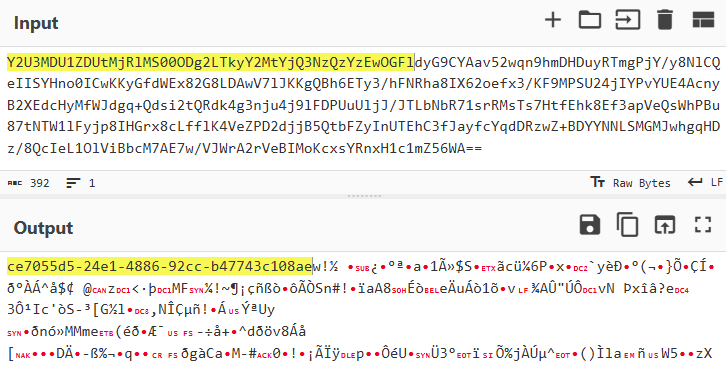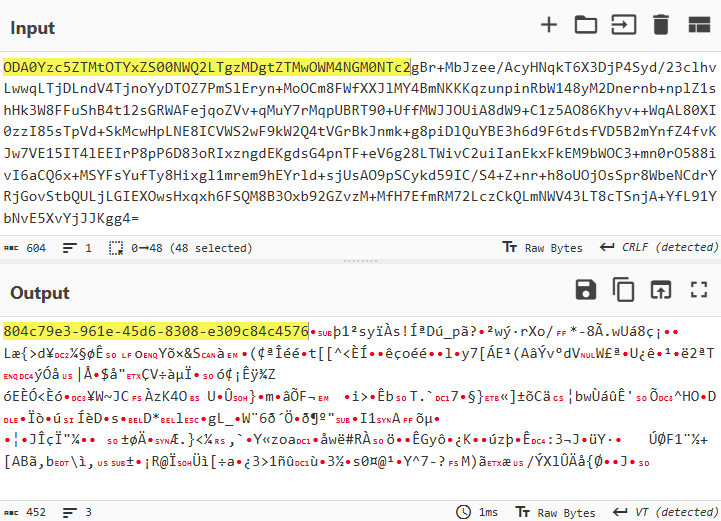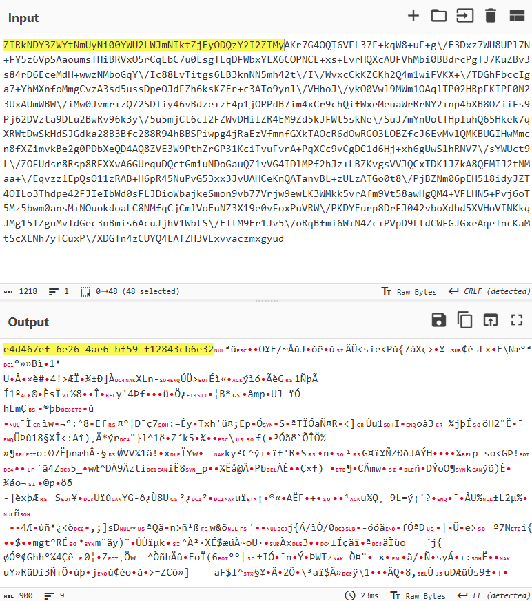 The content is encoded in Base64. Upon decoding, the structure of the transmitted information becomes visible: it begins with the UUID of the infected host, followed by a data block encrypted using AES-256.