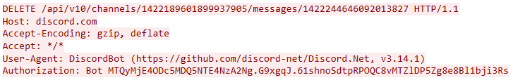 To establish a connection, the agent authenticates to the Discord server via the API call /api/v10/gateway/bot. We observe the following data in the network traffic: