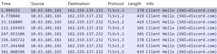If Discord usage is permitted on the network and there is no capability to decrypt traffic, it becomes nearly impossible to detect agent activity. In this scenario, behavioral analysis of requests to the Discord server may prove useful. Below is network traffic showing frequent TLS connections to the Discord server, which could indicate commands being sent to an agent.