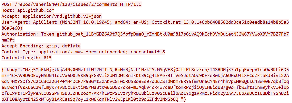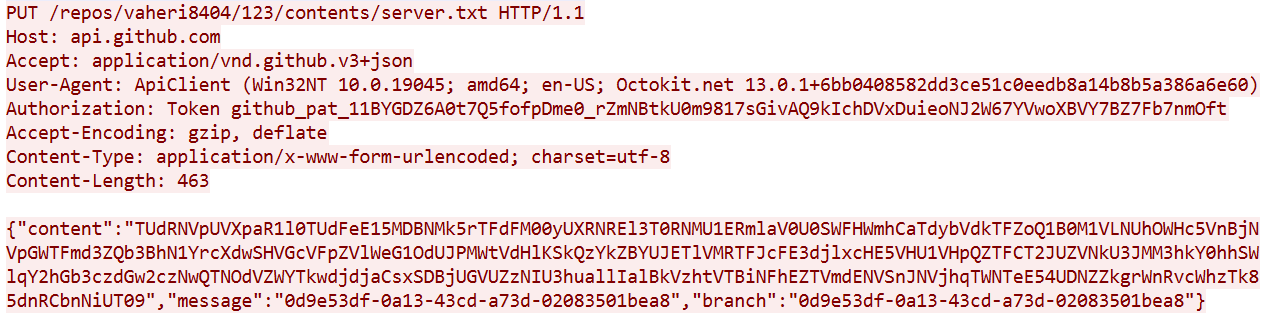 Agent communication with the server utilizes API calls to GitHub. The payload is encoded in Base64 and published in plaintext; therefore, anyone who can view the repository or analyze the traffic contents can decode it.