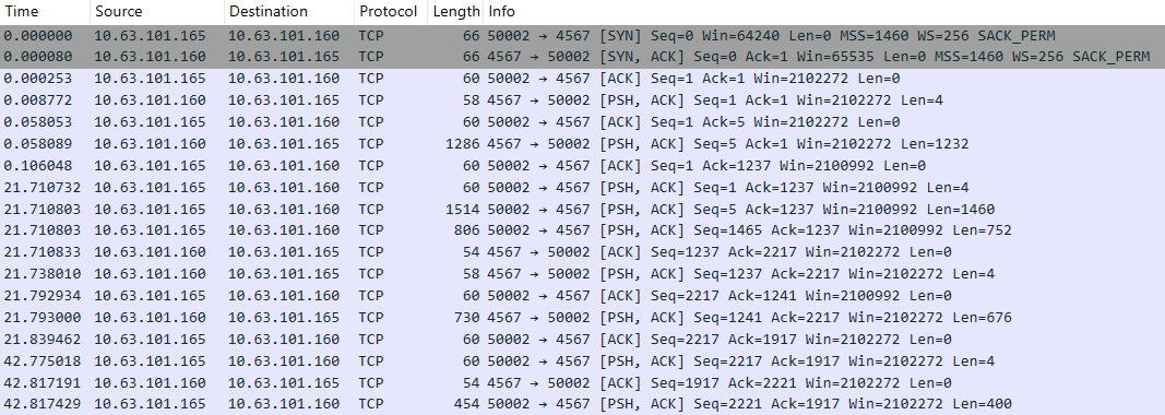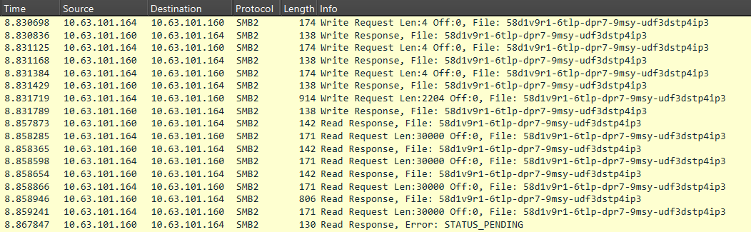 For SMB communication, agents encode and encrypt data according to the pattern: base64(UUID+AES256(JSON)). This data is then split into blocks and transmitted over the network. The screenshot below illustrates what a network session for establishing a connection between agents looks like in Wireshark.