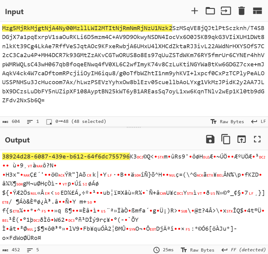 Decoding reveals the familiar data structure: UUID+AES256(JSON).