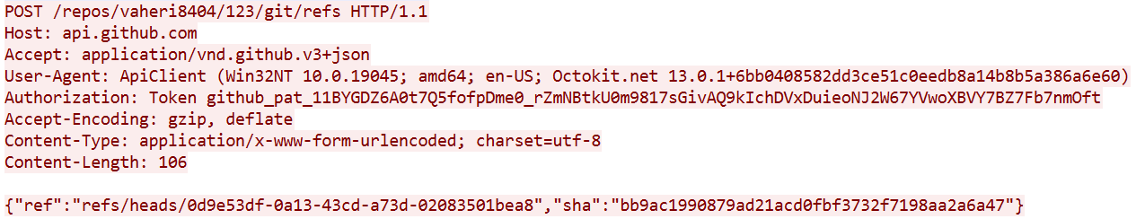 After creating the branch, the agent writes a file to it (sends a push request), which contains Base64-encoded data.