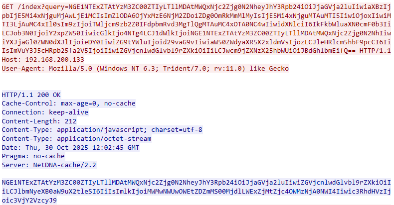 Below is an example of unencrypted Mythic network traffic over HTTP. During a GET request, data encoded in Base64 is passed in the value of the query parameter.