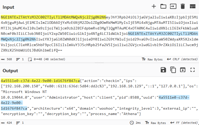 After decrypting the traffic and decoding from Base64, the communication data reveals the familiar structure: UUID+AES256(JSON).