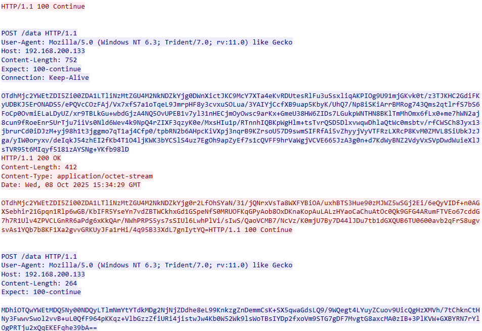 Agent activity can also be detected by analyzing data transmitted in SMB WriteRequest packets with the protocol flag Command: Write (9) and a distinct packet structure where the BlobOffset and BlobLen fields are set to zero. If the Data field is Base64-encoded and, after decoding, begins with a UUID-formatted string, this indicates a command-and-control channel.
