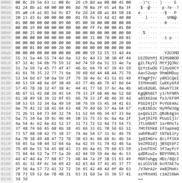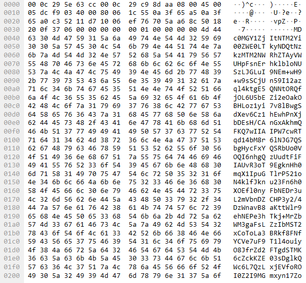 The data encoding scheme is also analogous to what we observed with SMB and appears as follows: base64(UUID+AES256(JSON)). Below is an example of a network packet containing Mythic data.