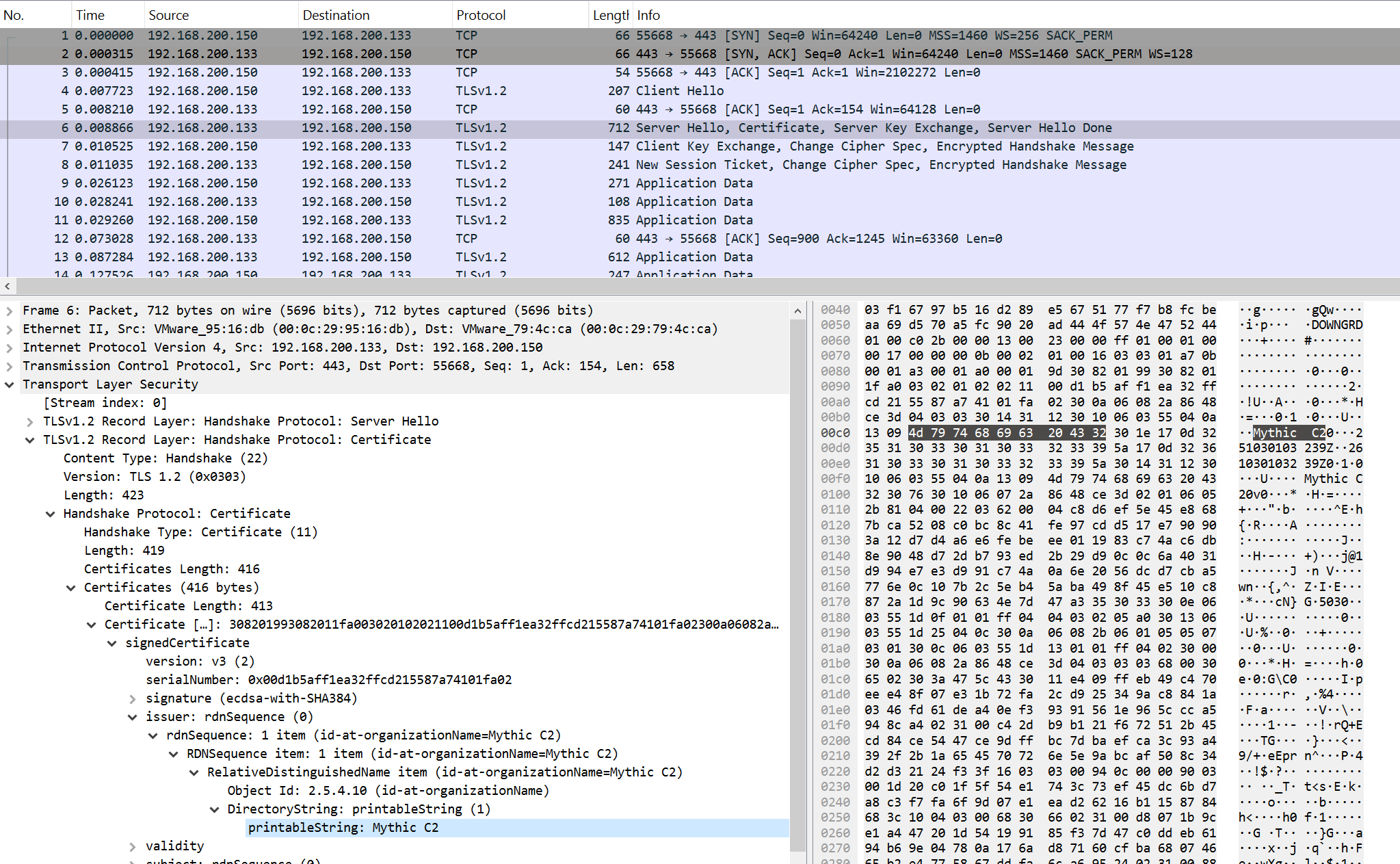 Mythic agents can communicate with the server via HTTPS using the corresponding transport module. In this case, data is encrypted with TLS and is not amenable to signature-based analysis. However, the activity of Mythic agents can be detected if they use the default SSL certificate. Below is an example of network traffic from a Mythic agent with such a certificate.