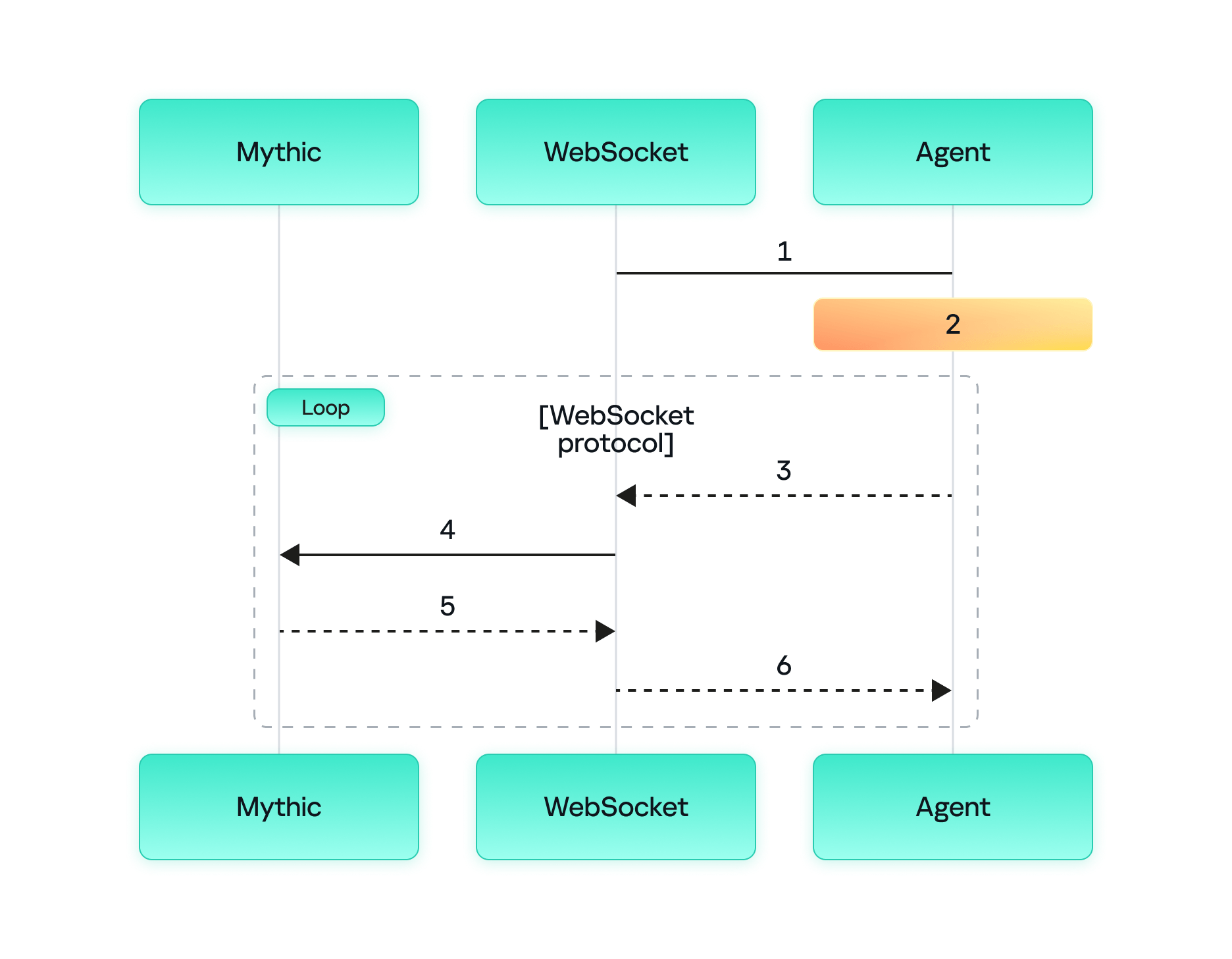 The WebSocket protocol enables full-duplex communication between a client and a remote host. Mythic can utilize it for agent management.
