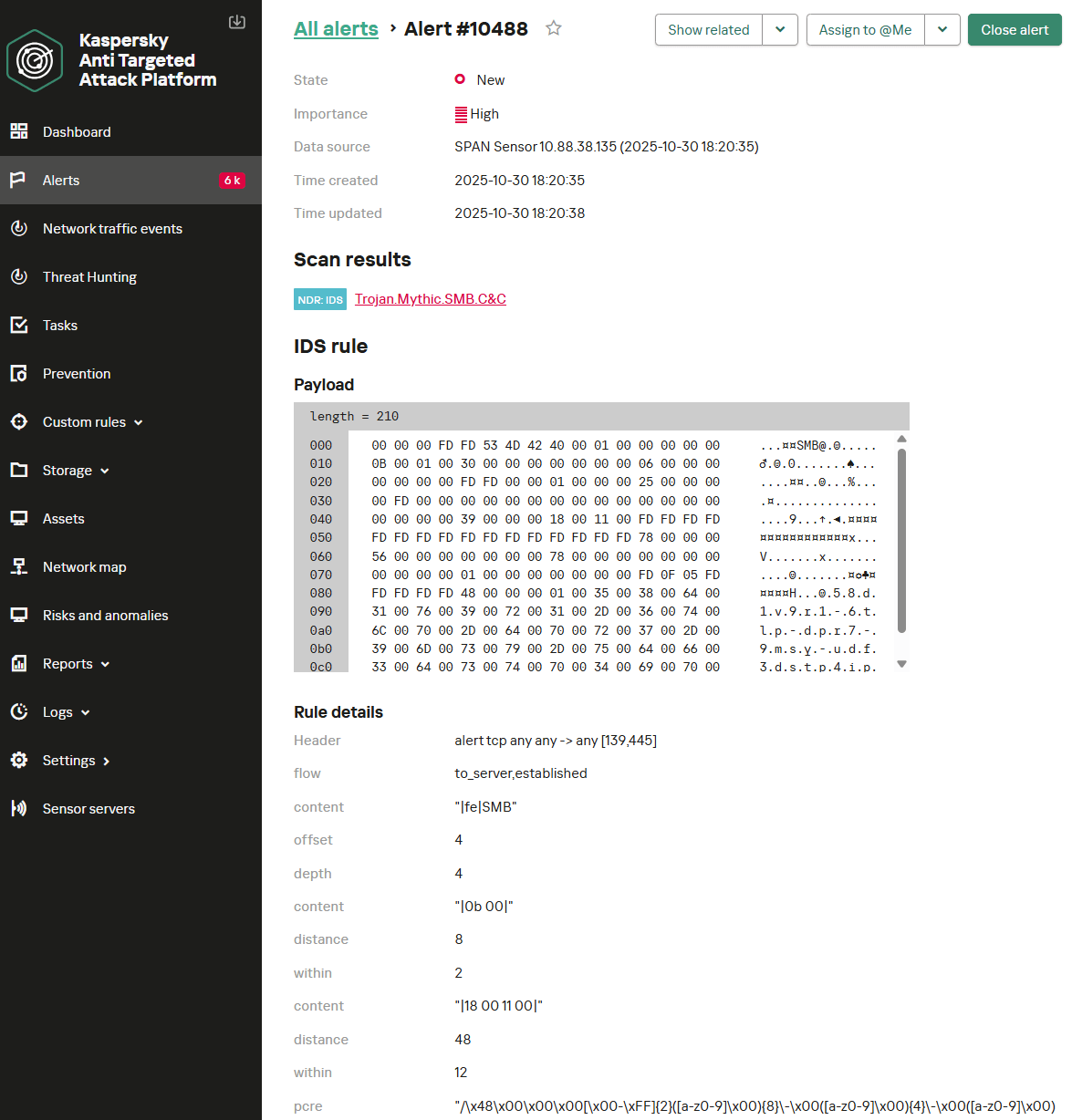 Below is the KATA NDR user interface displaying an alert about detecting a Mythic agent operating in P2P mode over SMB. In this instance, the first rule – which checks the request type, protocol flags, and the UUID pattern – was triggered.