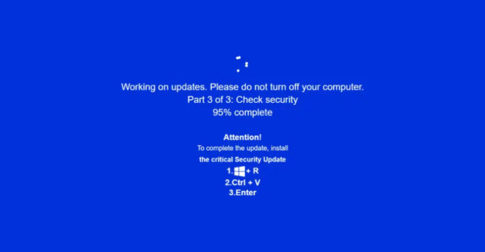 Perhaps the most concerning aspect of the attack is that the phony Windows update alert hijacks the entire screen and instructs the victim to open the Windows Run dialog, press Ctrl + V, and hit Enter, thereby triggering the infection sequence.