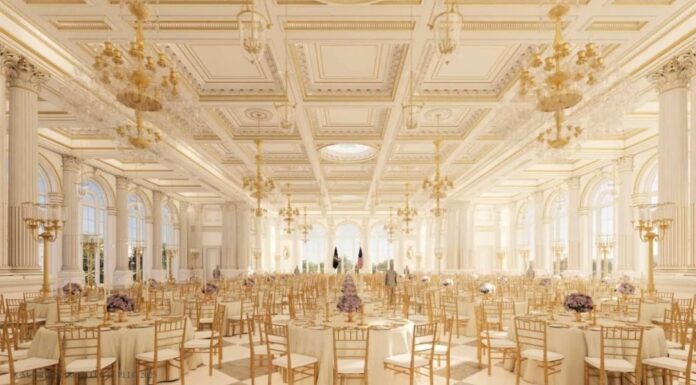 The design, led by Washington D.C.–based McCrery Architects, leans heavily into Trump’s signature aesthetic. Architectural renderings showcase neoclassical opulence: Corinthian columns with gilded details, golden chandeliers, coffered ceilings, and arched windows on three sides overlooking the White House grounds.